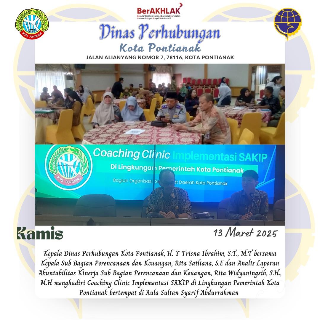 Kepala Dinas Perhubungan Kota Pontianak, H.Y Trisna Ibrahim, ST.,MT bersama Kepala Sub Bagian Perencanaan dan Keuangan, Rita Satliana, SE dan Analis Laporan Akuntabilitas Kinerja Sub Bagian Perencanaan dan Keuangan , Rita Widyaningsih, SH.,MH menghadiri Coaching Clinic Imlementasi SAKIP di Lingkungan Pemerintah Kota Pontianak berempat di Aula Sultan Syarif Abdurrahman
