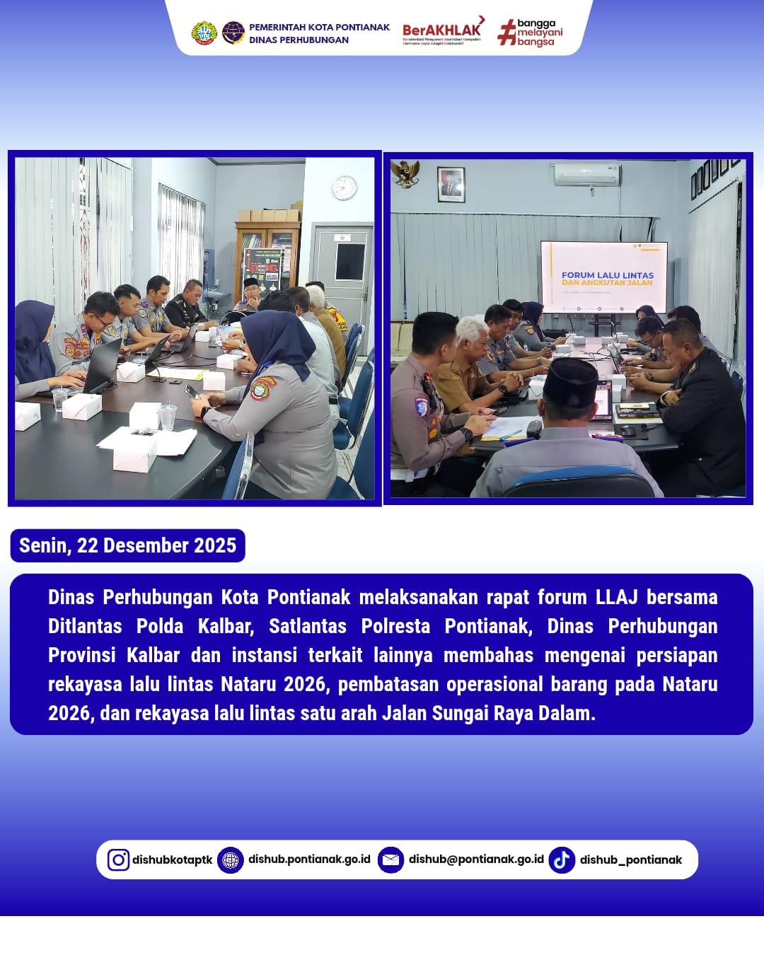 Dinas Perhubungan Kota Pontianak melaksanakan rapat forum LLAJ bersama Ditlantas Polda Kalbar, Satlantas Polresta Pontianak, Dinas Perhubungan Provinsi Kalbar dan instansi terkait lainnya membahas mengenai persiapan rekayasa lalu lintas Nataru 2026, pembatasan operasional angkutan barang pada Nataru 2026, dan rekayasa lalu lintas satu arah Jalan Sungai Raya Dalam.