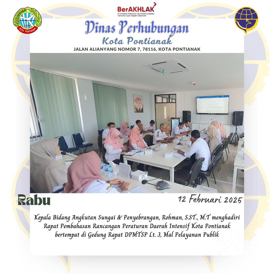Kepala Bidang Angkutan Sungai dan Peyeberangan Rohman, S.ST.,MT menghadiri Rapat Pembahasan Rancangan Peraturan Daerah Intensif Kota Pontianak betempat di Gedung Rapat DPMTSP Lt. 3 Mall Pelayanan Publlik