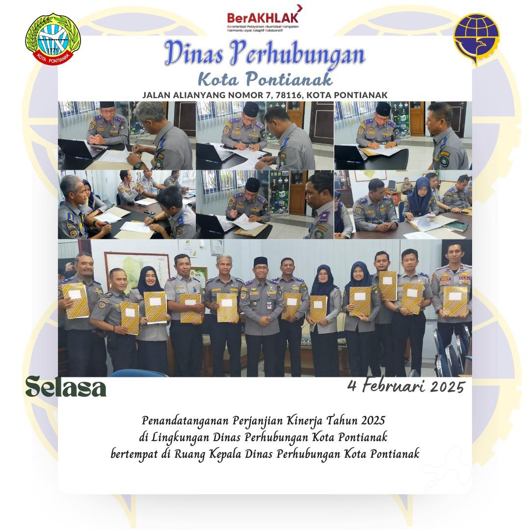 Penanda Tanganan Perjanjian Kinerja Tahun 2025 Oleh: Admin 04 Feb 2025 Penanda Tanganan Perjanjian Kinerja Tahun 2025 di Lingkungan Dinas Perhubungan Kota Pontianak bertempat di Ruang Kepala Dinas Perhubungan Kota Ponontianak