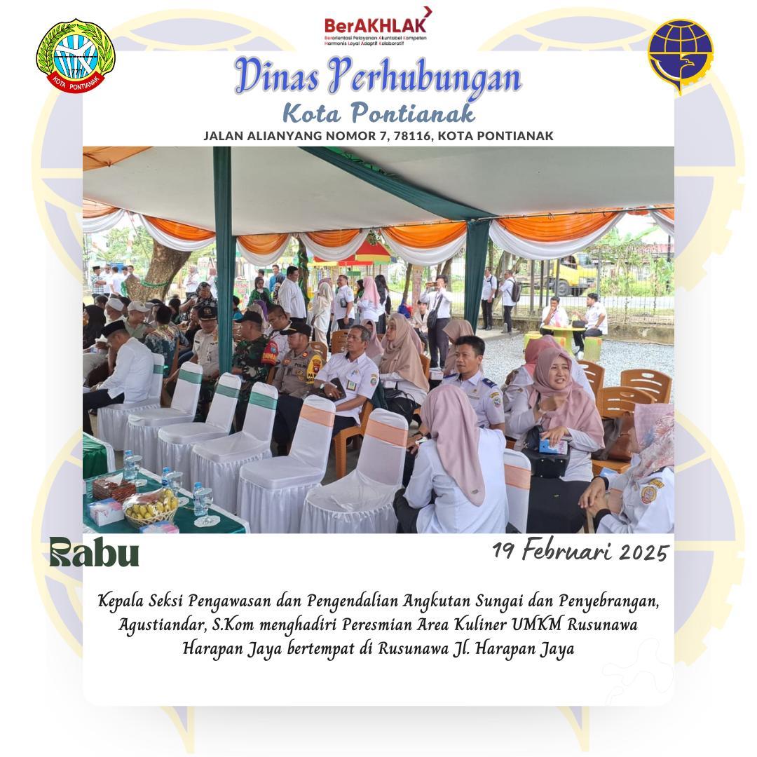 Peresmian Area Kuliner UMKM Rusunawa Harapan Jaya Oleh: Admin 19 Feb 2025 Kepala Seksi Pengawasan dan Pengendalian Angkutan Sungai dan Penyeberangan Agustiandar, S.Kom menghadiri Peresmian Area Kuliner UMKM Rusunawa Harapan Jaya berempat di Rusunawa Jl. Harapan Jaya