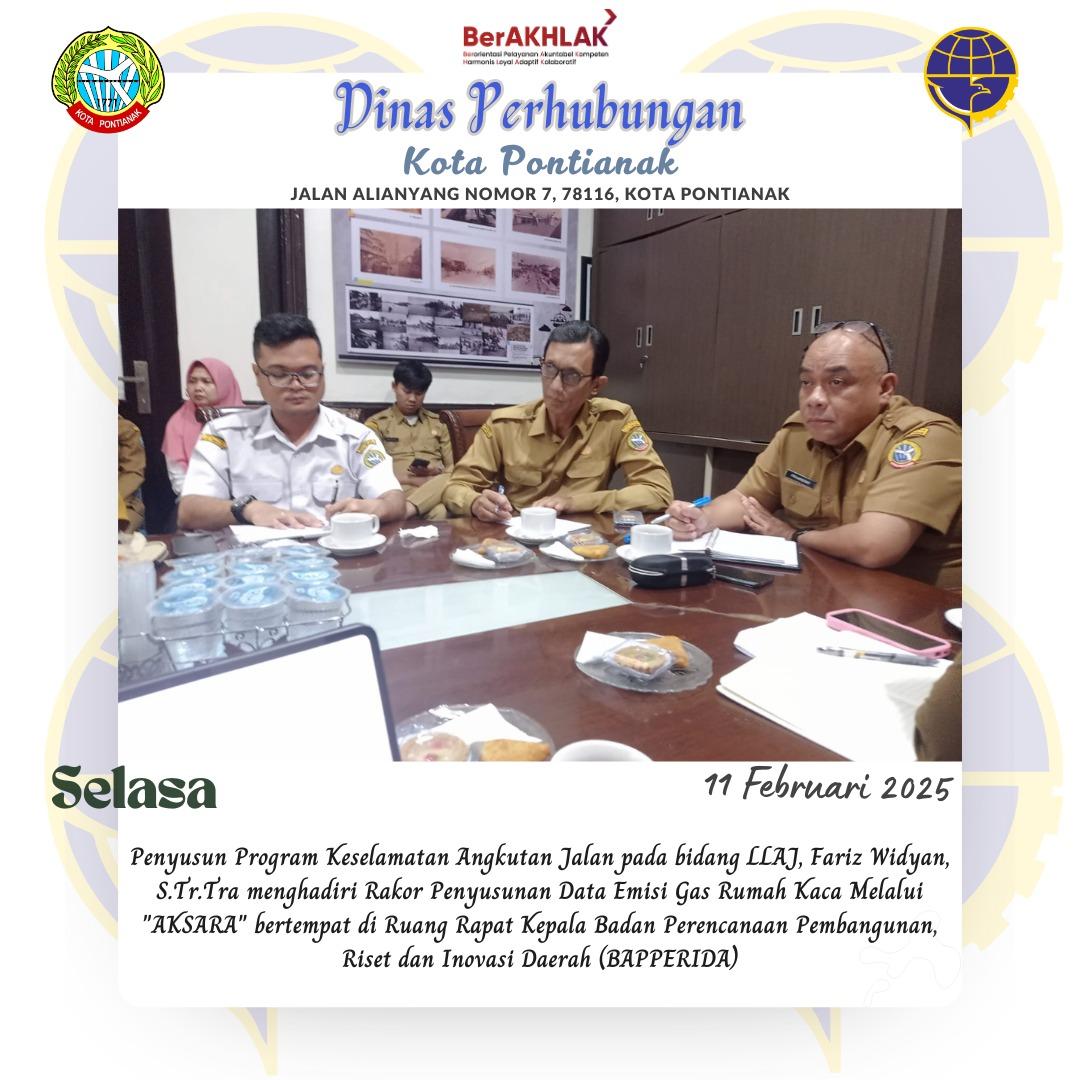 Penyusun Program Keselamatan Angkutan Jalan pada Bidang LLAJ Fariz Widyan, S.Tr.Tra menghadiri Rakor Penyusunan Data Emisi Gas Rumah Kaca Melalui "AKSARA" bertempat di Ruang Rapat Kepala Badan Perencanaan Pembangunan Riset dan Inovasi Daerah (BAPPERIDA)
