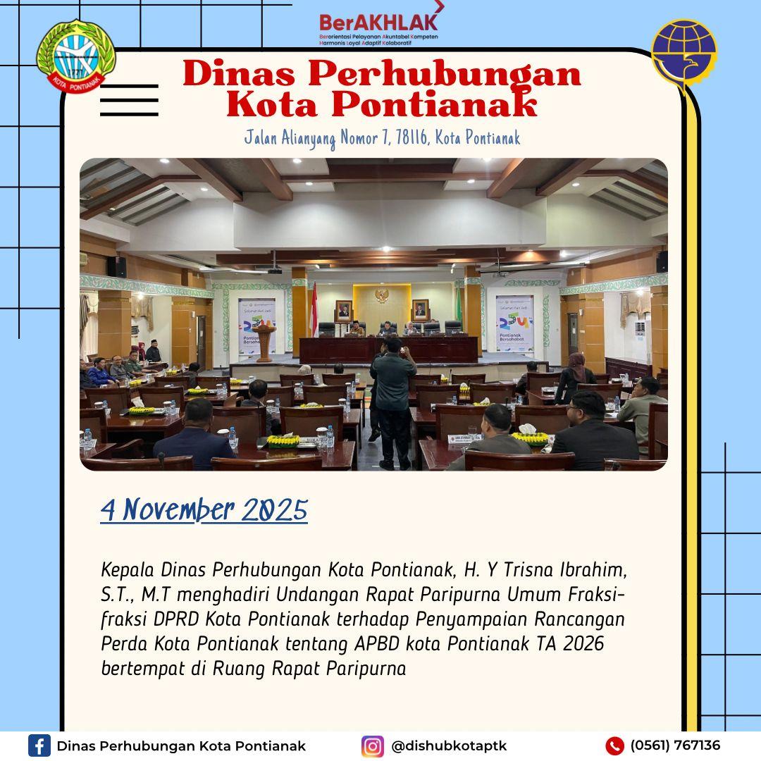 Kepala Dinas Perhubungan Kota Pontianak, H. Y Trisna Ibrahim, S.T., M.T menghadiri Undangan Rapat Paripurna Umum Fraksi- fraksi DPRD Kota Pontianak terhadap Penyampaian Rancangan Perda Kota Pontianak tentang APBD kota Pontianak TA 2026 bertempat di Ruang Rapat Paripurna