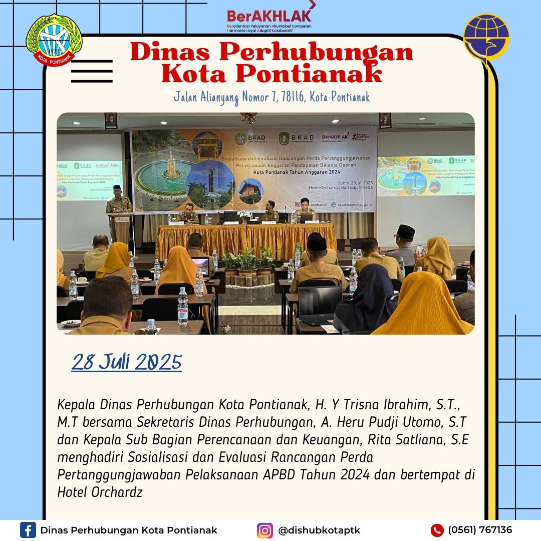 Kepala Dinas Perhubungan Kota Pontianak, H. Y Trisna Ibrahim, S.T., M.T bersama Sekretaris Dinas Perhubungan, A. Heru Pudji Utomo, S.T dan Kepala Sub Bagian Perencanaan dan Keuangan, Rita Satliana, S.E menghadiri Sosialisasi dan Evaluasi Rancangan Perda Pertanggungjawaban Pelaksanaan APBD Tahun 2024 dan bertempat di Hotel Orchardz