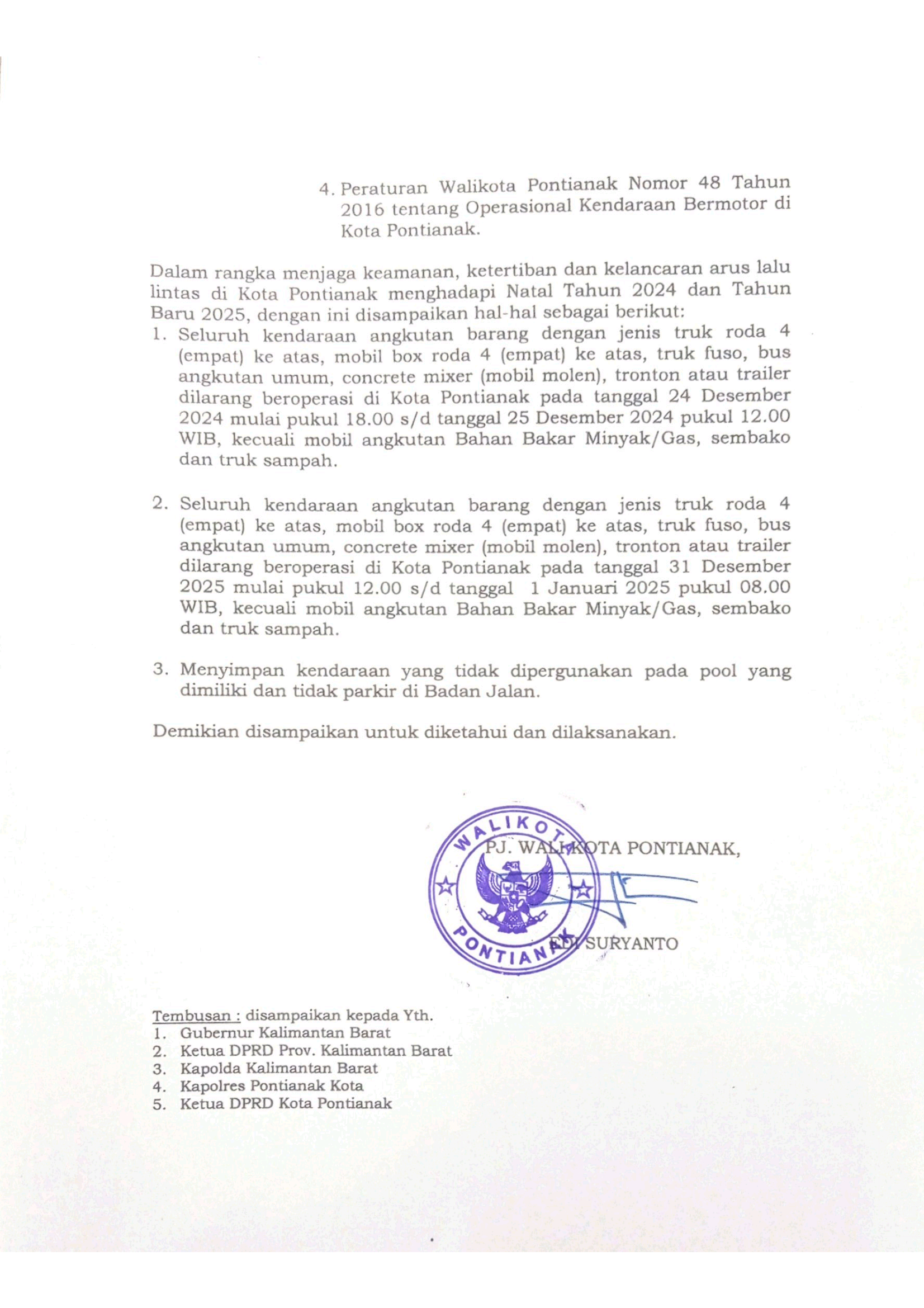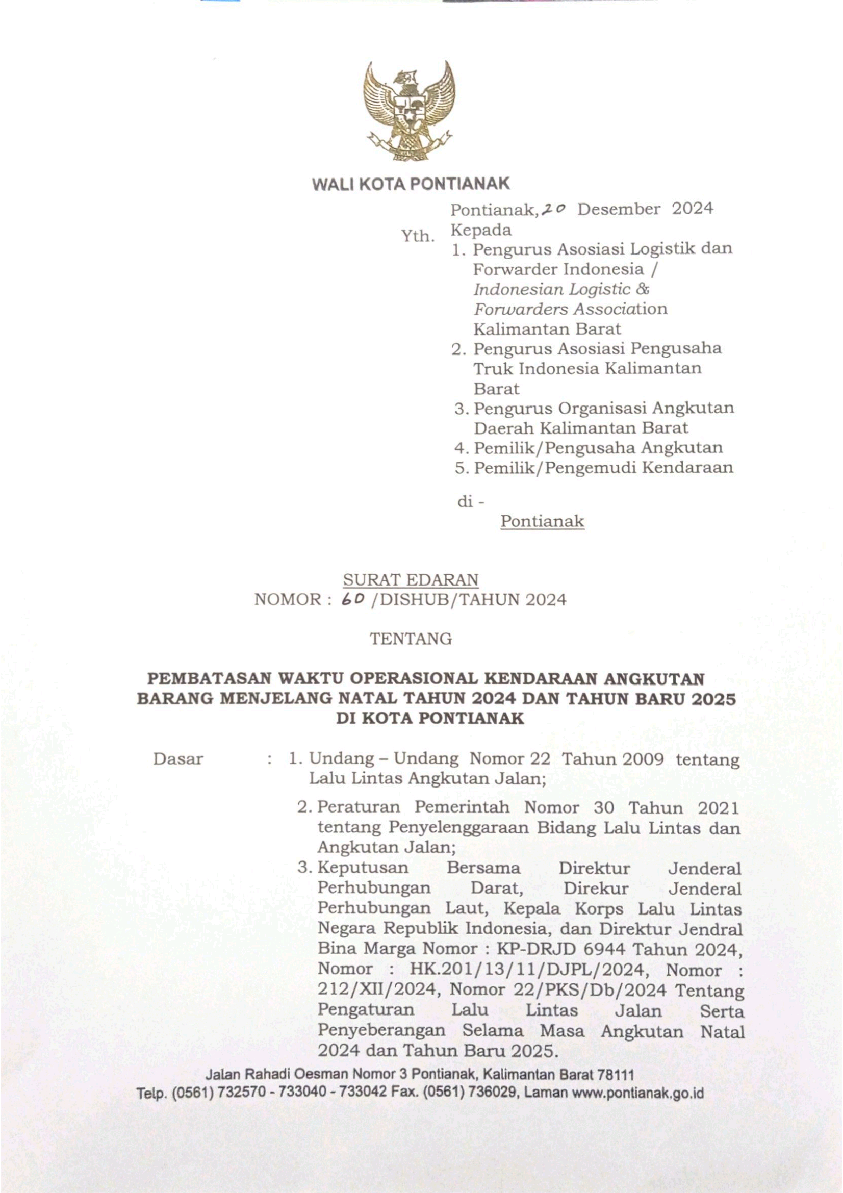 SURAT EDARAN PEMBATASAN WAKTU OPERASIONAL KENDARAAN ANGKUTAN BARANG MENJELANG NATAL TAHUN 2024 & TAHUN BARU 2025 DI KOTA PONTIANAK Oleh: Admin 21 Dec 2024