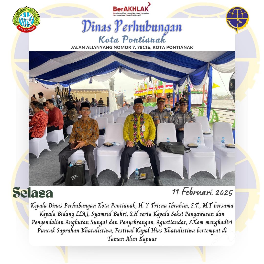 Kepala Dinas Perhubungan Kota Pontianak, H.Y. Trisna Ibrahim, ST., MT. bersama Kepala Bidang LLAJ, syamsul Bahri, SH serta Kepala Seksi Pengawasan dan Pengendalian Angkutan Sungai dan Penyeberangan, Agustiandar, S.Kom menghadiri Puncak Saprahan Khatulistiwa, Festival Kapal Hias Khatulistiwa bertempat di Taman Alun Kapuas.